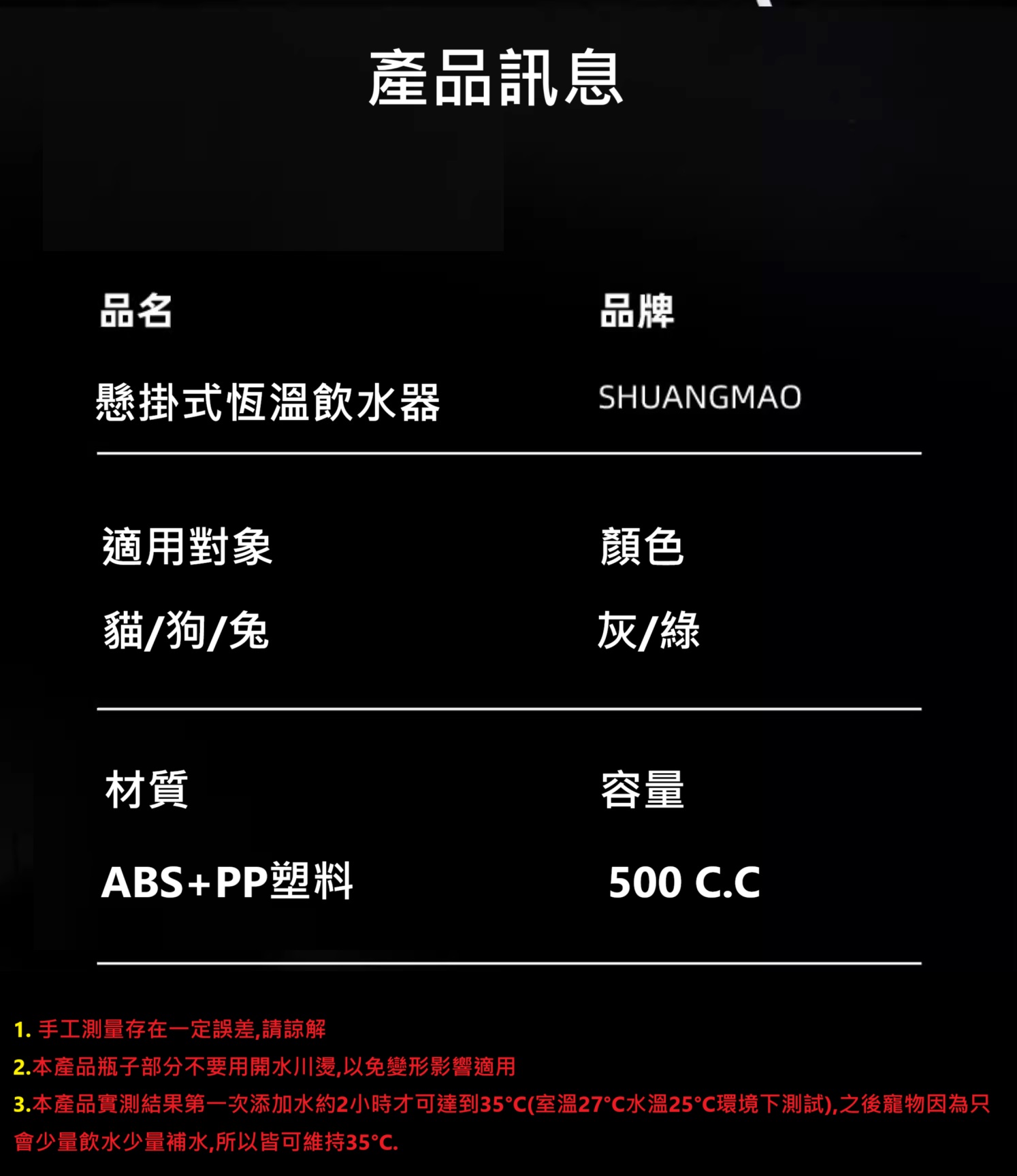 🔺🔺3. 本產品實測結果第一次添加水約2小時才可達到35°C(室溫27°C水溫25°C環境下測試),之後寵物因為只會少量飲水少量補水,所以皆可維持35°C.