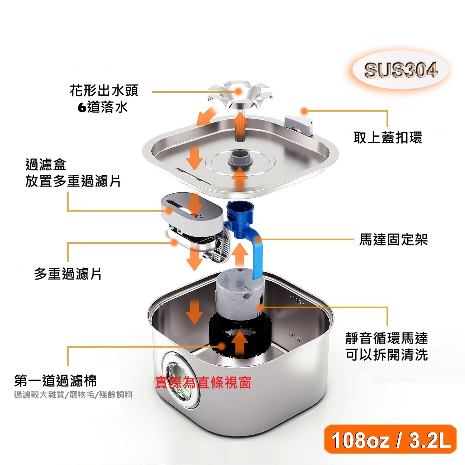 【Master 水族】3.2LSUS304不鏽鋼 寵物飲水器 帶視窗 喝水器 貓狗通用 貓狗飲水機 循環過濾