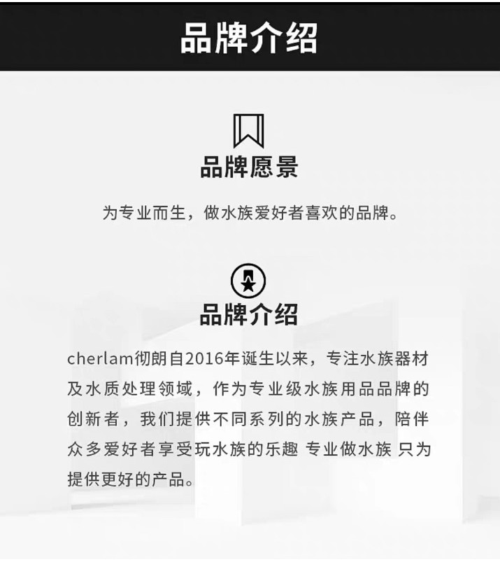 📜品牌介紹:cherlam彻(同徹)朗自2016年誕生以來,專注水族器材及水質處理領域,作為專業級水族用品品牌的創新者,我們提供不同系列的水族產品,陪伴眾多愛好者享受玩水族的樂趣,專業做水族只為提供更好的產品。並且成為國內眾多賽事的贊助商。